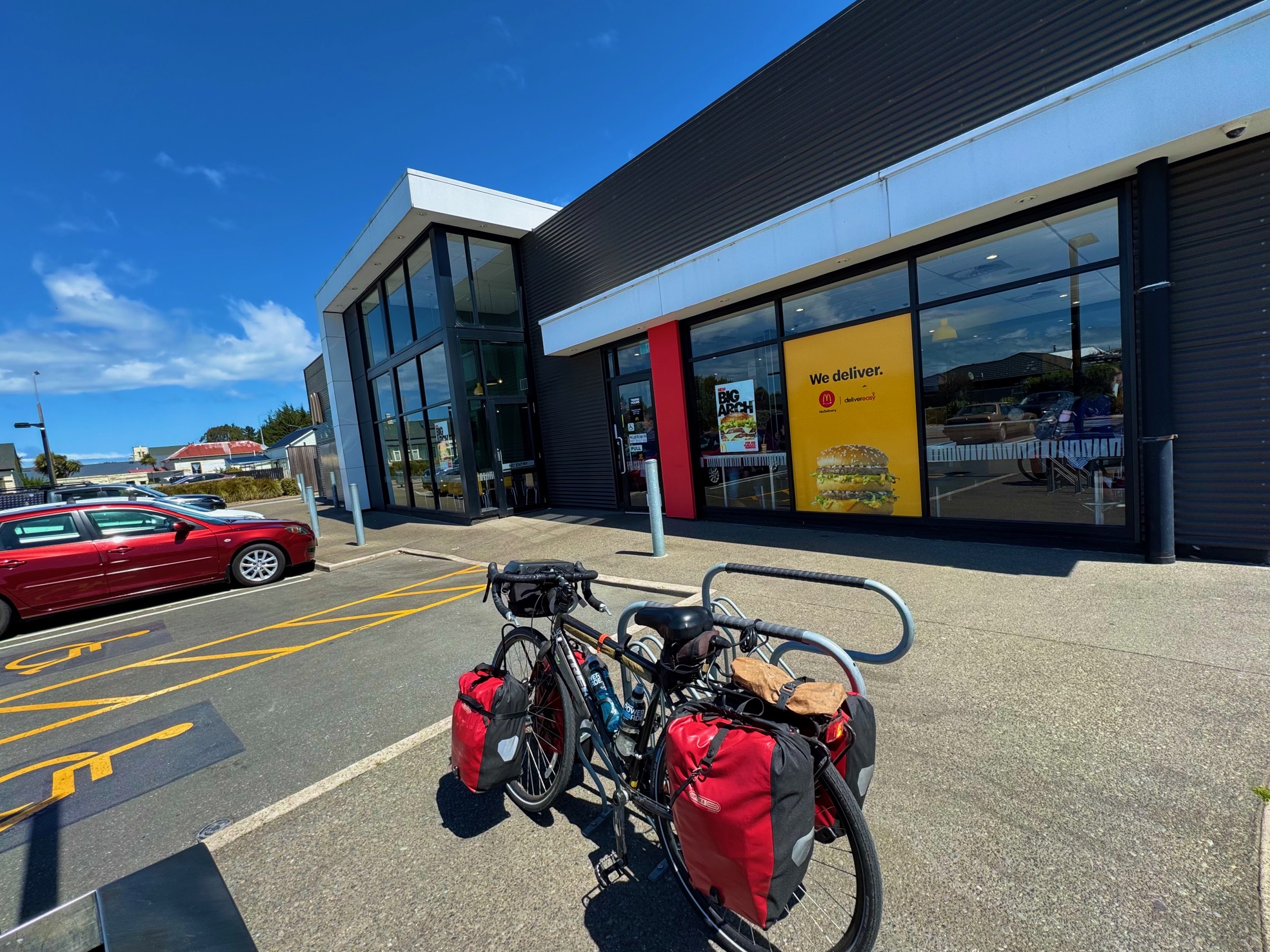 写真: 世界最南端のマクドナルド 旅自転車はフル装備の状態。重量60kgほどありますが、 それでも限界まで軽量化しています。